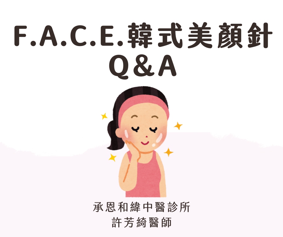 F.A.C.E. 美顏針法是韓國宋貞和教授來台傳授,對於調整臉形、改善老化更明顯。F.A.C.E. 美顏針專科醫師的培養需要許多老師與助教耐心的教導,每次上課都有小考,課程結束後要進行筆試與術科考試,才能拿到證照;拿到證照的醫師也會繼續參加顏面針灸醫學會的進階課程,充實自己,期望能帶給病人更好的治療。