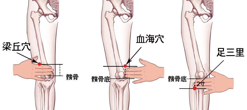 •梁丘穴(大腿外側):緩解急性疼痛 。