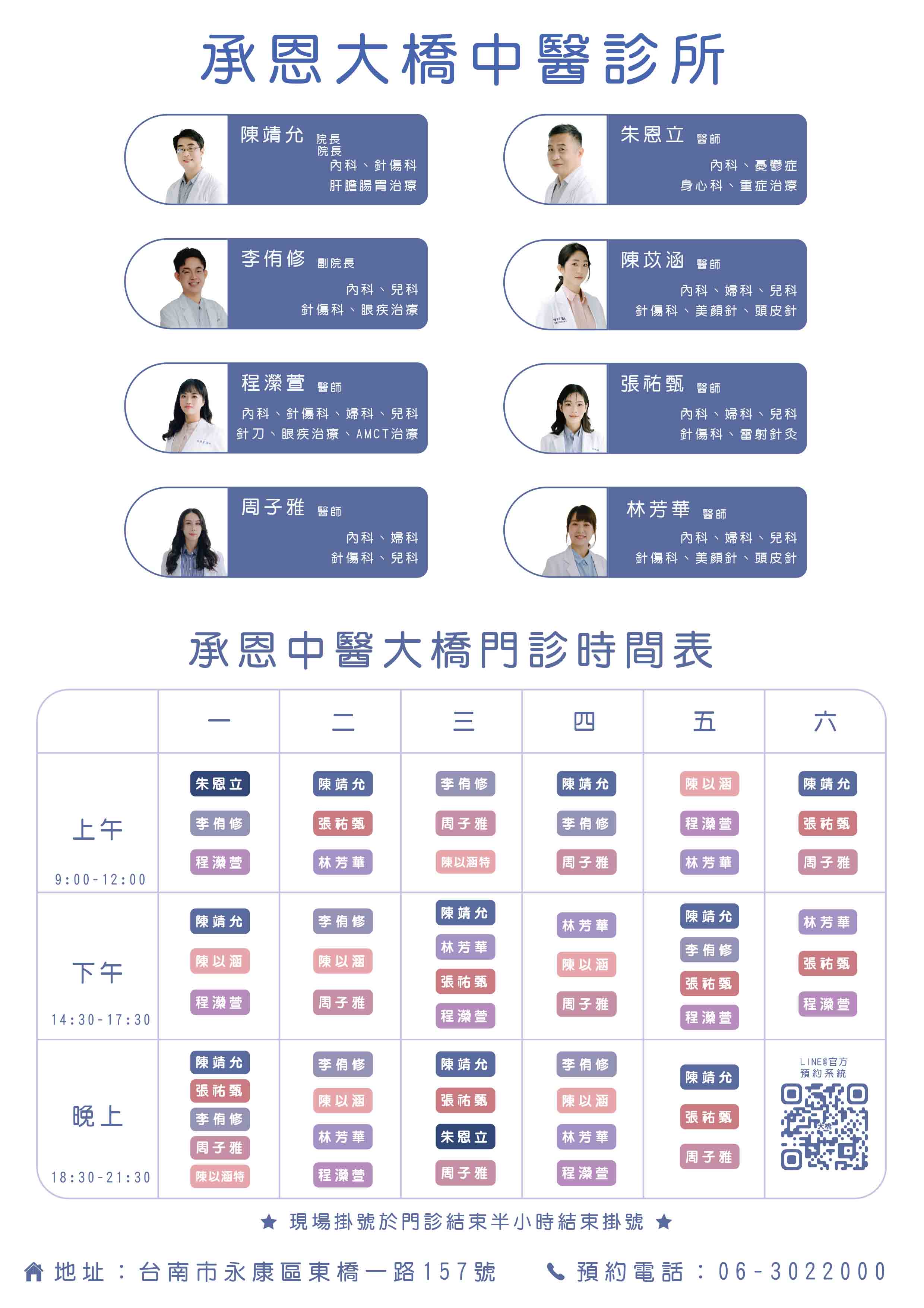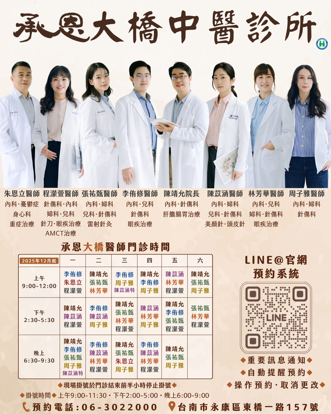 公告醫師門診時間表,開放LINE官方線上預約及電話預約